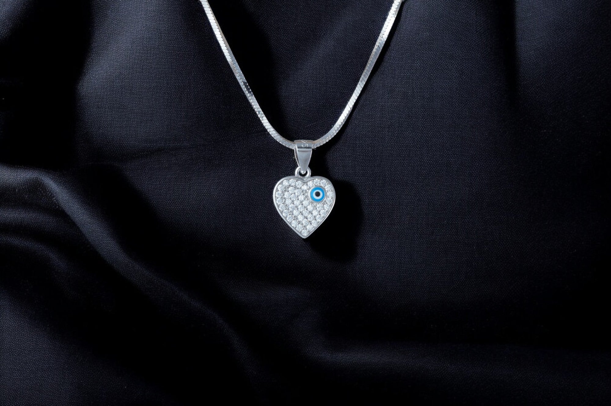 Evil Eye Heart Shaped 925 Sterling Silver Pendant With Chain